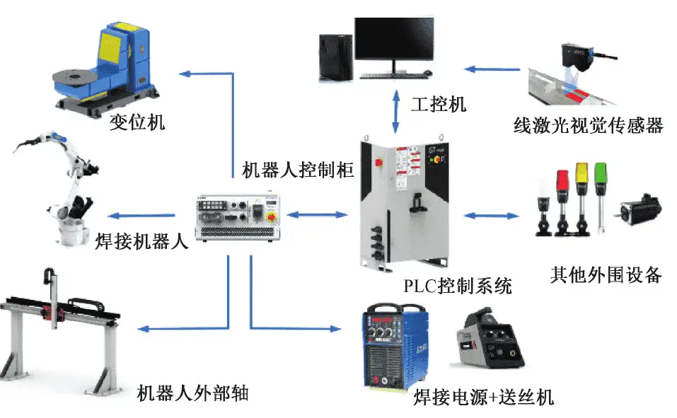 The software component mainly includes a PLC control system, offline programming software, welding process database, vision system, and information display software. The PLC control system acts as the “central nervous system” of the entire system, responsible for logical control. The offline programming software, welding process database, vision processing software, and information display software operate on the IPC. The offline programming software plans the robot’s scanning and welding paths based on the workpiece model. The welding process database provides process data. The vision system collects weld seam information, processes images and point clouds through algorithms running on the IPC, and determines the weld seam coordinates. The information display software visualizes welding progress and parameters in real time based on system feedback signals.